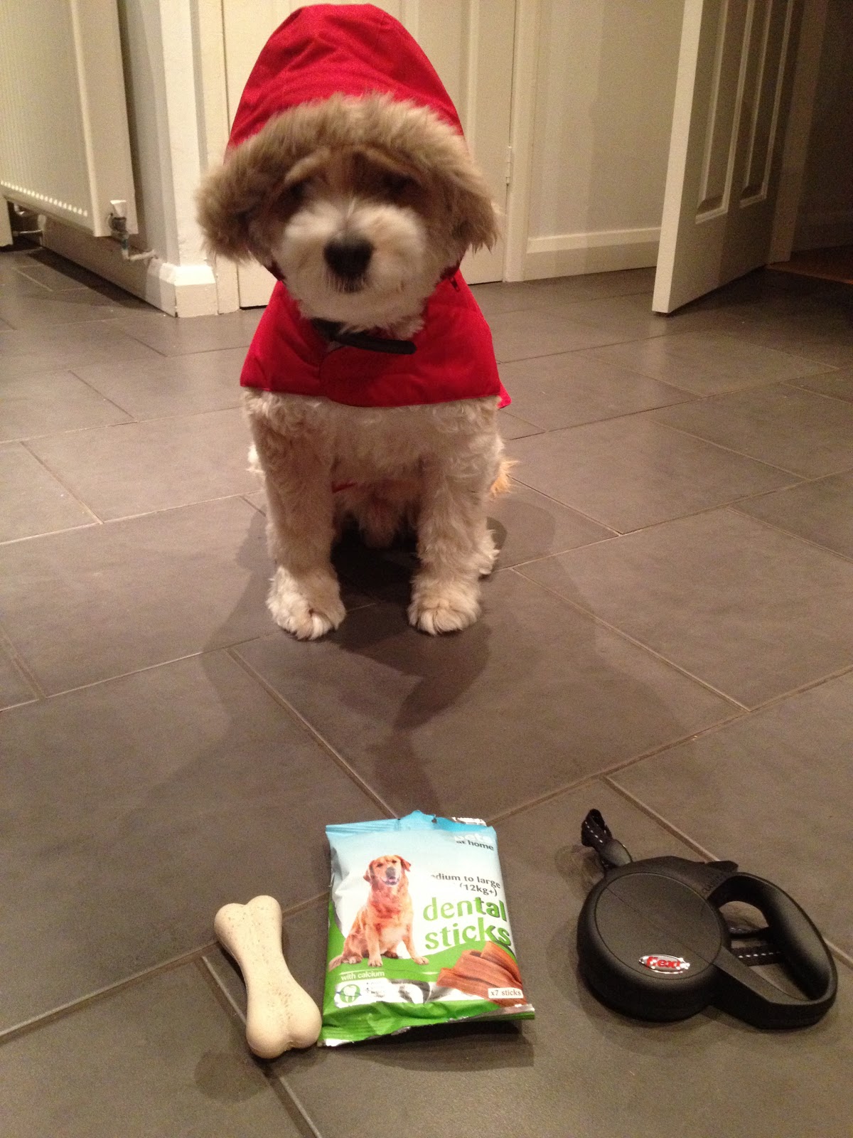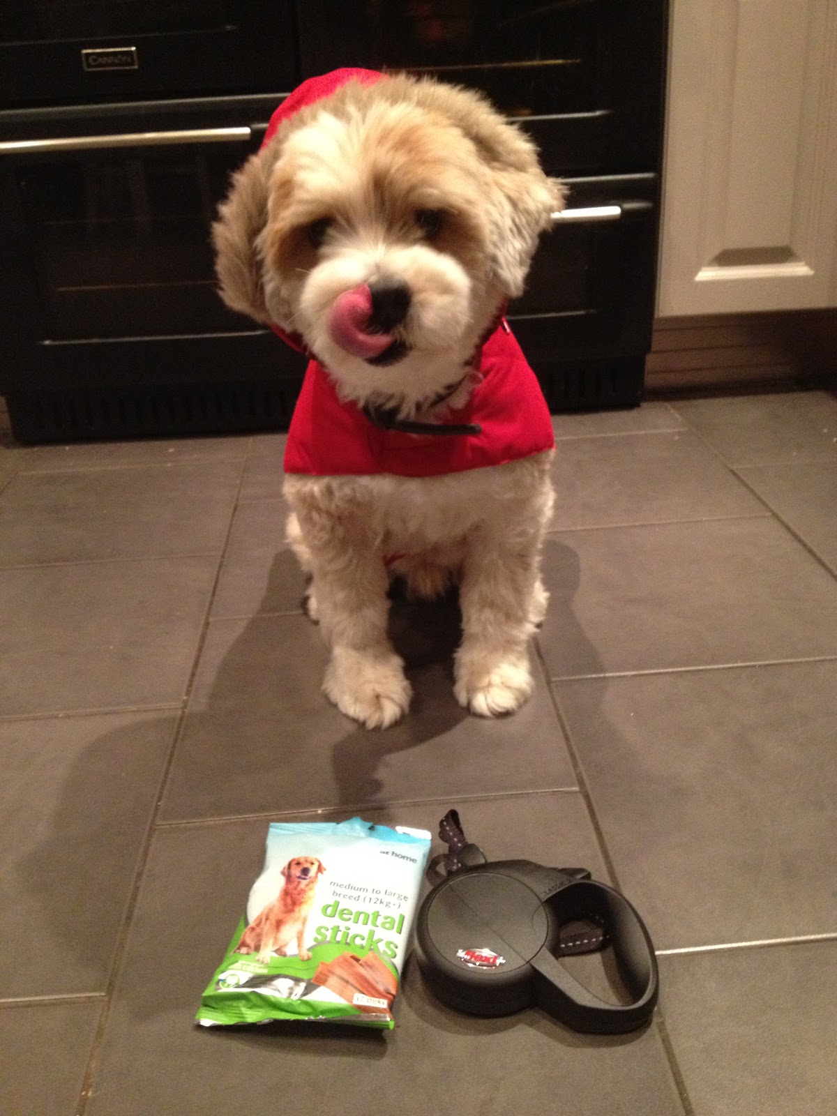 Came home today and mummy (well grandma… my mummy. sorry mum if you’re reading this) had bought him a new coat, lead and treats 😀