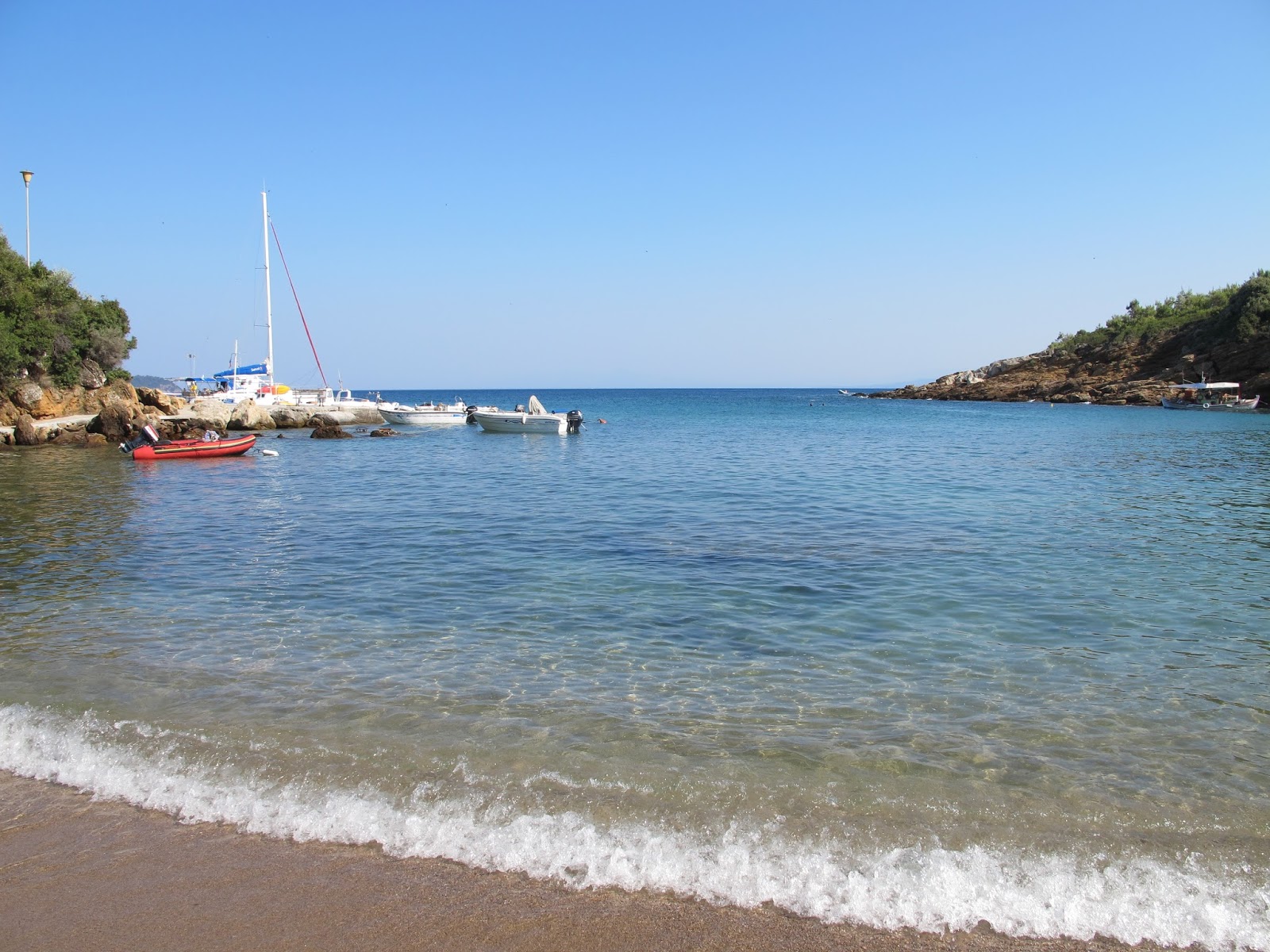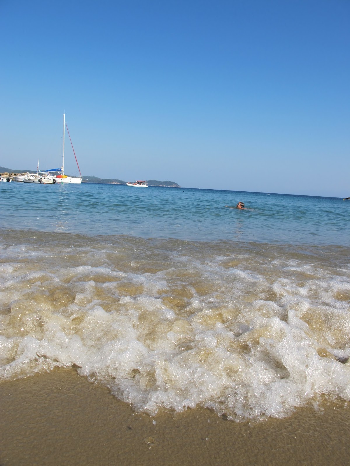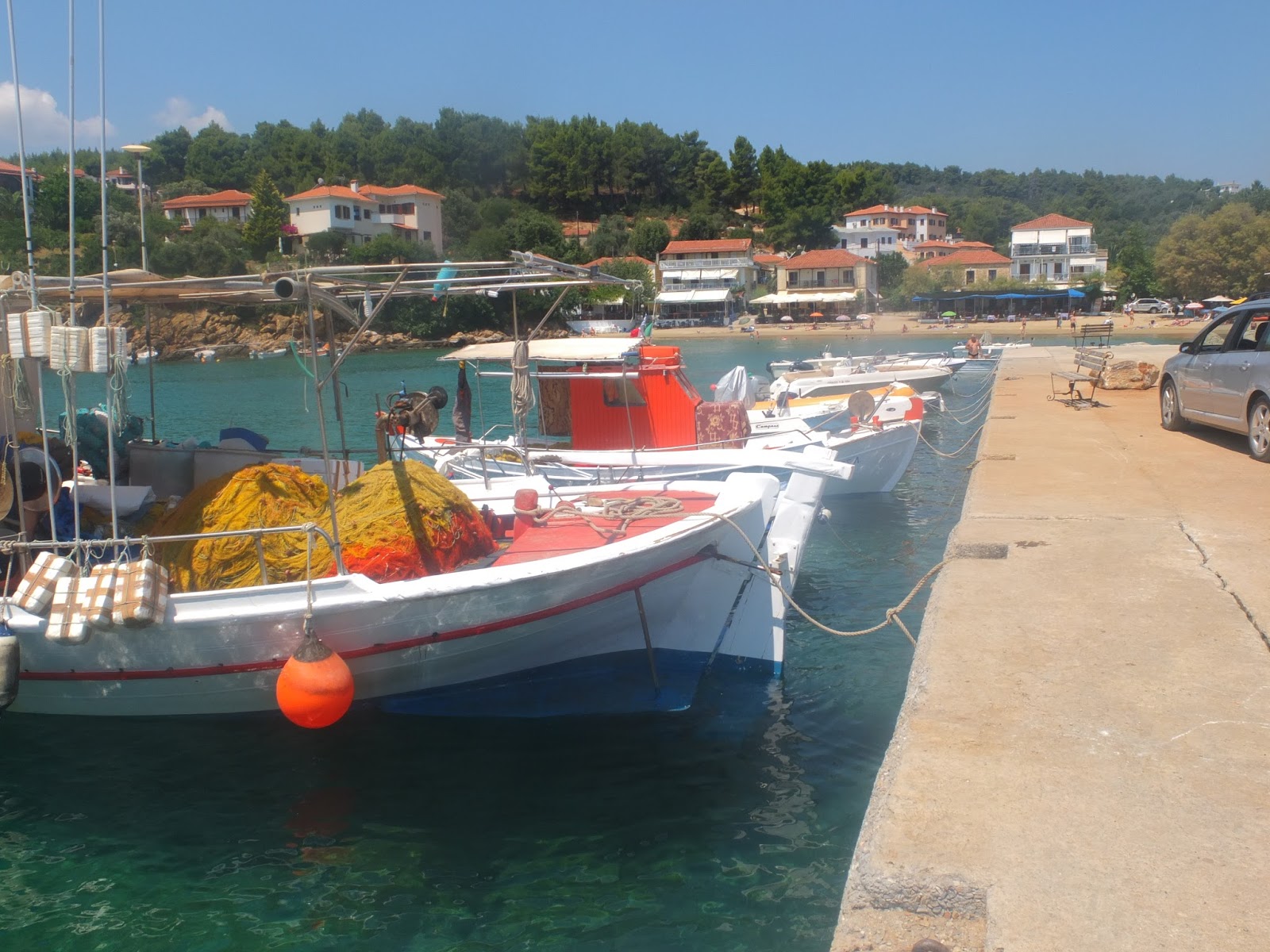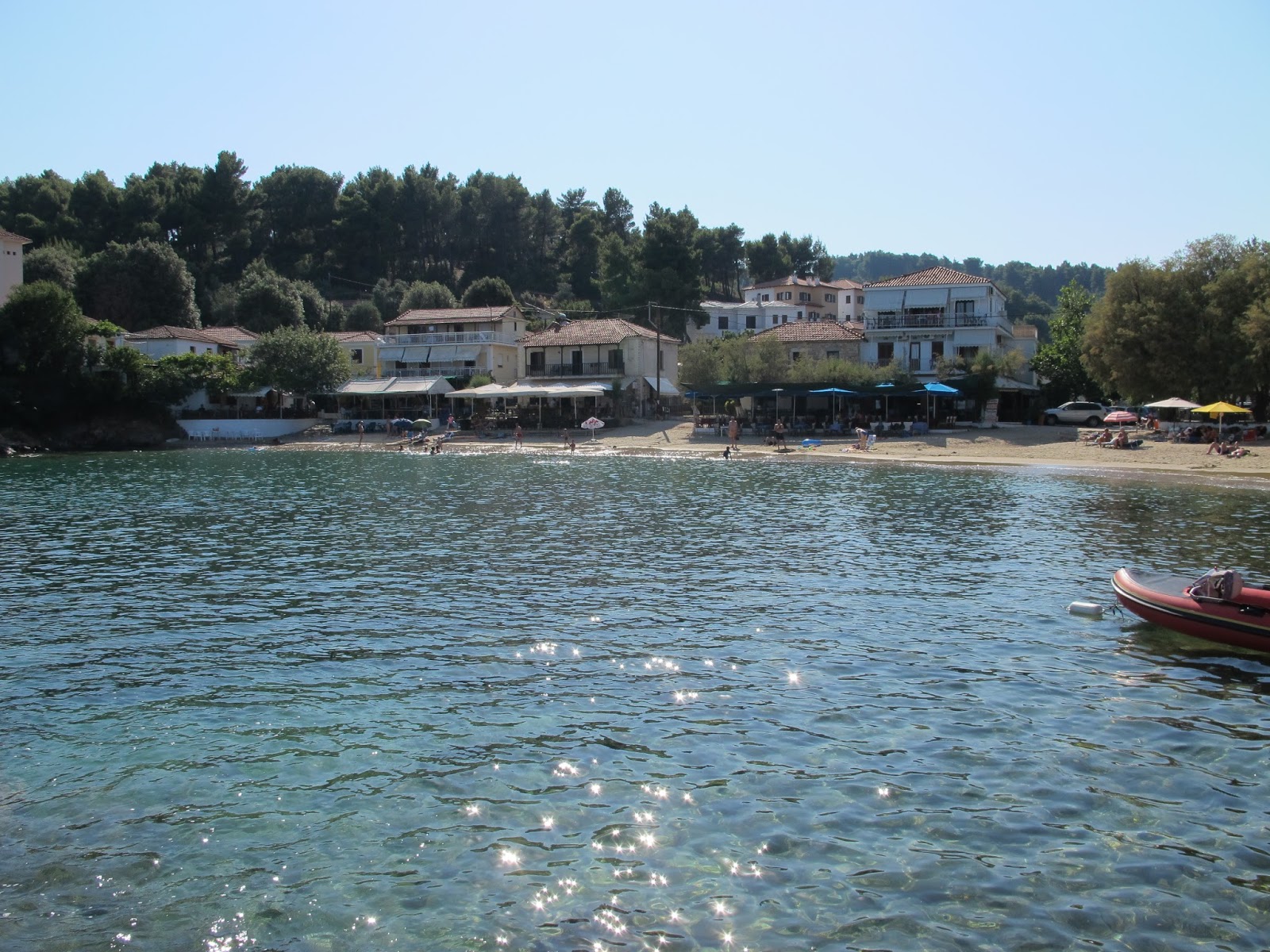 We were feeling quite pleased with ourselves having found a beautifully quiet bay. All that was in sight was 3 beach tavernas and a couple of people lazed on loungers along the sandy beach which hugged the bay.