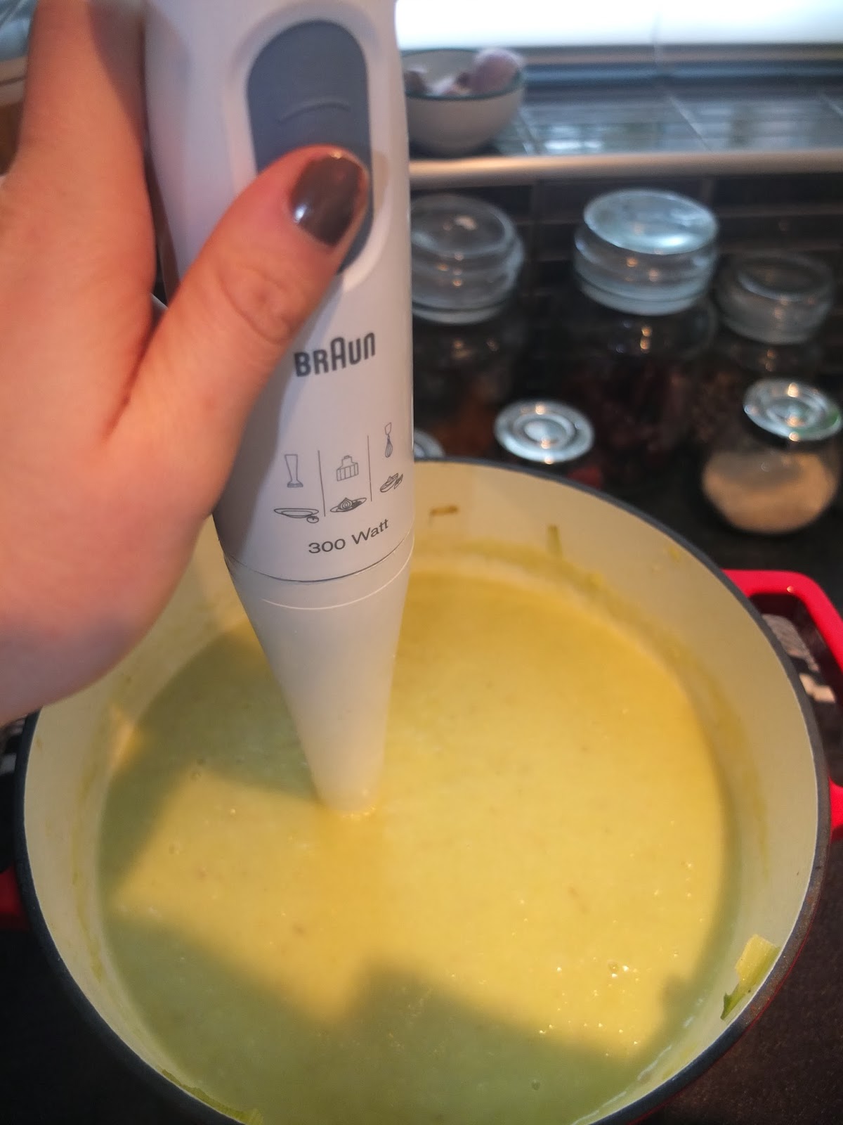 8. Once the contents have cooled slightly, grab your hand blender and bleeeeend the ingredients to the consistency you like. 🙂