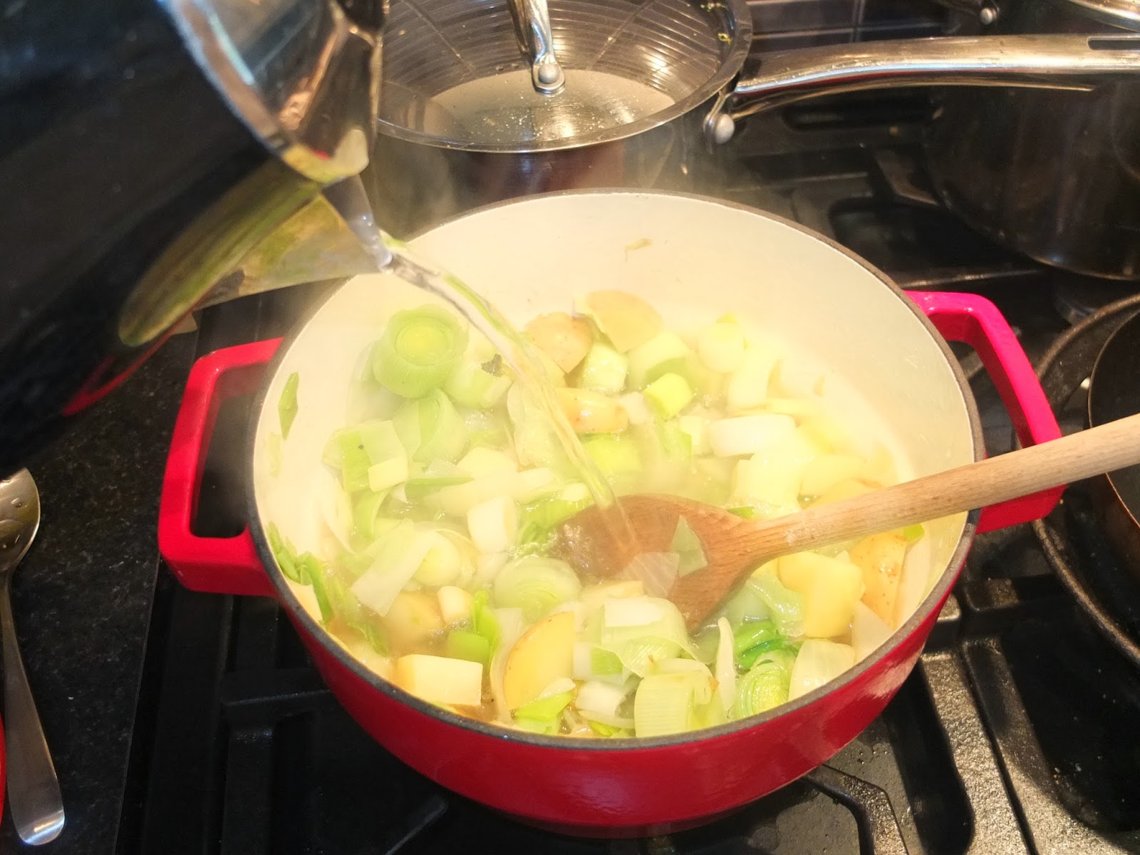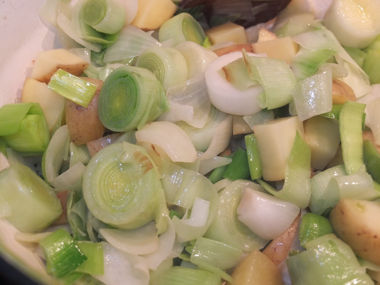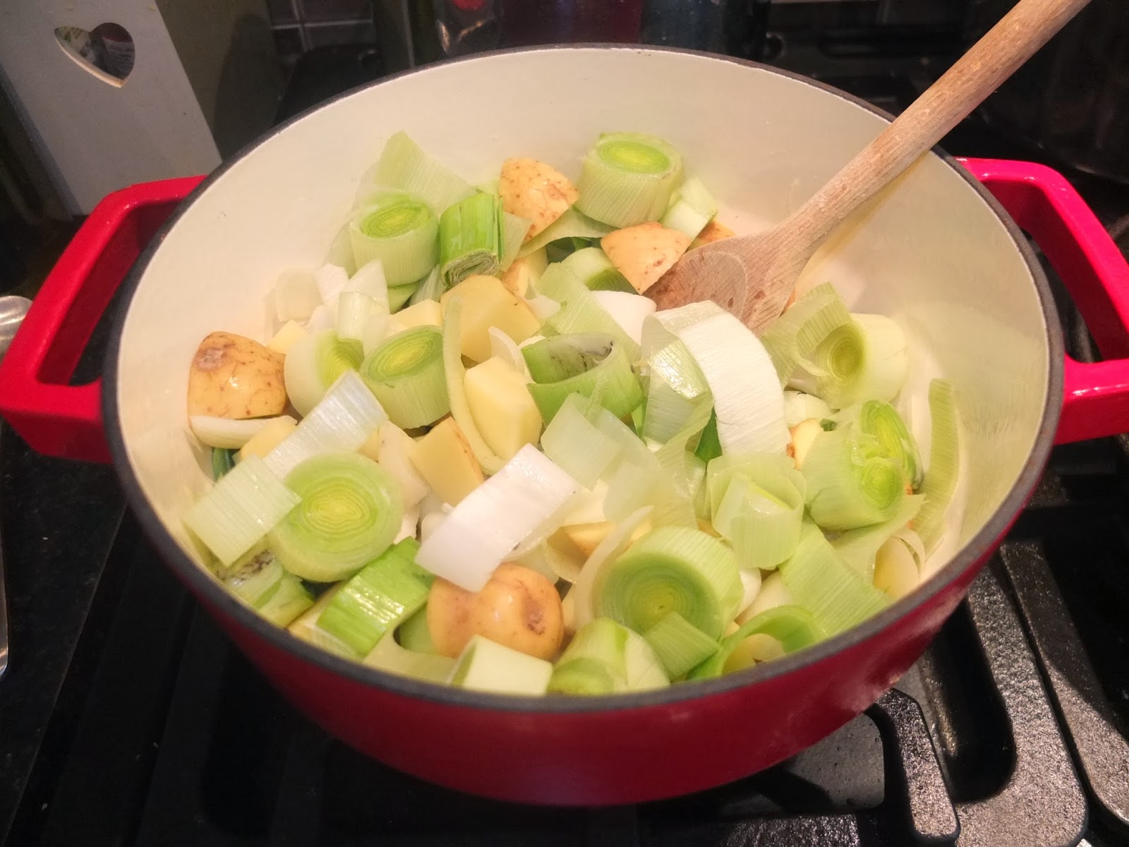 A few leeks, a few potatoes, an onion, a clove of garlic, a splash of olive oil and some salt and pepper 🙂
