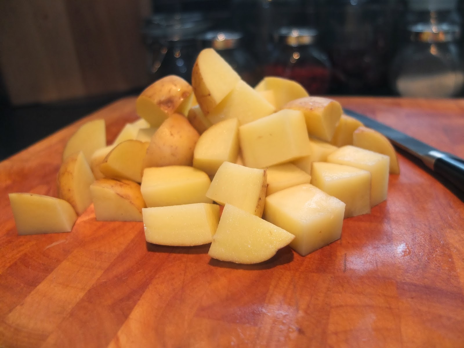 6. Put the lid on the pan and reduce the heat for 10-15 minutes. (Until the potatoes are soft and you can slip a fork in and out with ease).