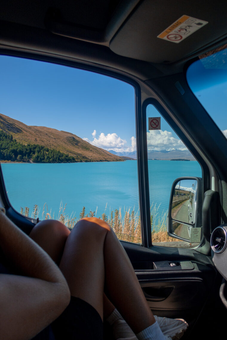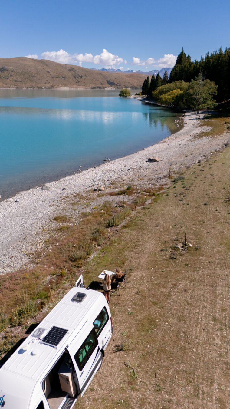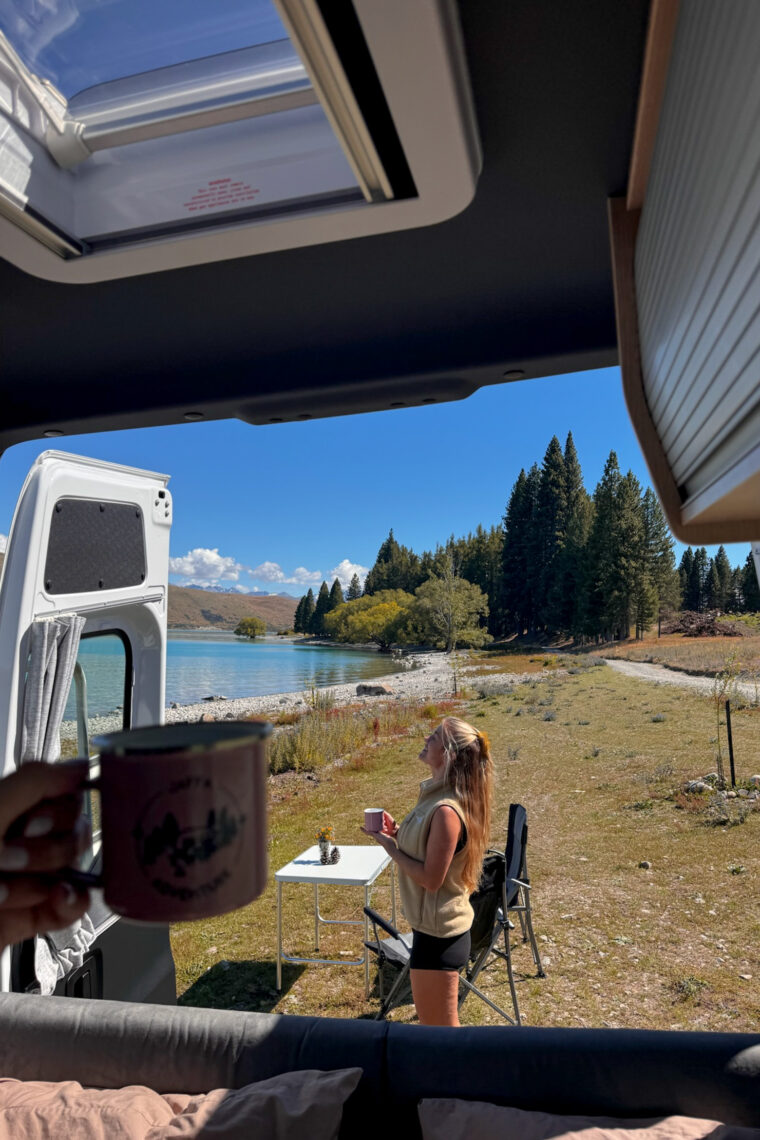 Does it get much better than brewing coffee or making breakfast in your campervan with a view? Now add in the Lake Tekapo blues pouring in through every window, and you have a scene from your wildest camping dreams.